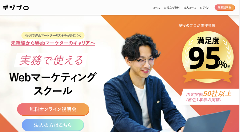 実際の企業の課題に対して改善案を提案するカリキュラムが用意されており、現場のような環境で実力を磨けます。手厚いキャリアサポートも特徴で、専属のキャリアアドバイザーが面接対策や書類添削を行い、未経験からのマーケター転職を強力にバックアップしてくれるのも魅力です。本気で転職を成功させたい方におすすめのスクールです。
