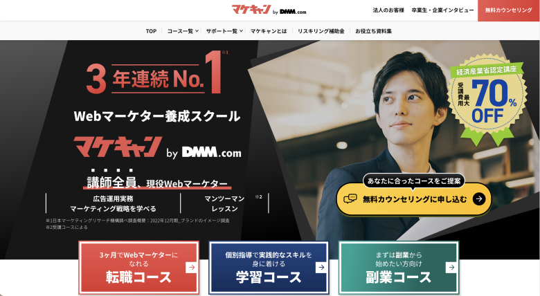 マケキャンbyDMM.comは、大手DMMグループが運営する、未経験からの転職に特化したWebマーケティングスクールです。平日はオンラインの動画教材で基礎を学び、週末は現役マーケターの講師を交えたグループワークで実践的なプランニングを行うという、インプットとアウトプットの反復学習が徹底されています。