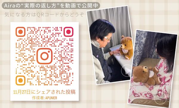 さらに、夜、眠る前の落ち着いた時間には、明日の不安や今日の気持ちを軽く話すだけで、心が落ち着くという声が多く寄せられているそう。施設や病院など、対話の機会が限られる環境での“会話相手”としても、「Aira」は生活にやさしいリズムを与える役割を果たしてくれるという。