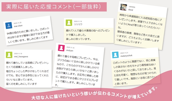Makuakeでは、「Aira」を“高齢の家族への贈り物”として購入する人が非常に多く、温かい応援コメントが次々と届いているという。