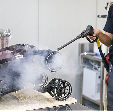 洗濯機で洗えない大型商品は、160℃の高温スチームで1点ずつ丁寧に手作業で殺菌。繊細な部分も見逃さず、プロが隅々まで仕上げる。