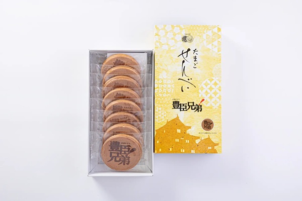 「豊臣たまごせんべい2枚×8袋入」は、卵のやさしい甘さを活かした素朴でどこか懐かしい味わいが特長。表面には大河ドラマ『豊臣兄弟!』のタイトルロゴを焼き印し、歴史の物語を感じさせる特別仕様とした。