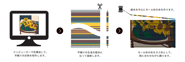 「シェニール織」は、ドイツを本場としたヨーロッパ伝統織物で、カーペットのために開発された技術。一度織り上げた生地を縦に切り分け、撚りをかけてモール状にしたものを横糸として再び織り上げるので「再織」とも呼ばれている。触り心地や丈夫さに定評がある織物だ。