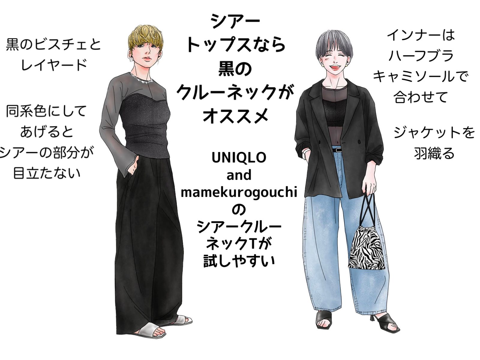 初めて使うシアーアイテムは、黒のクルーネックTがオススメ。トレンドアイテムは長年使うようなアイテムではないので、気軽に挑戦できるファストファッションブランドで購入するのがオススメです。