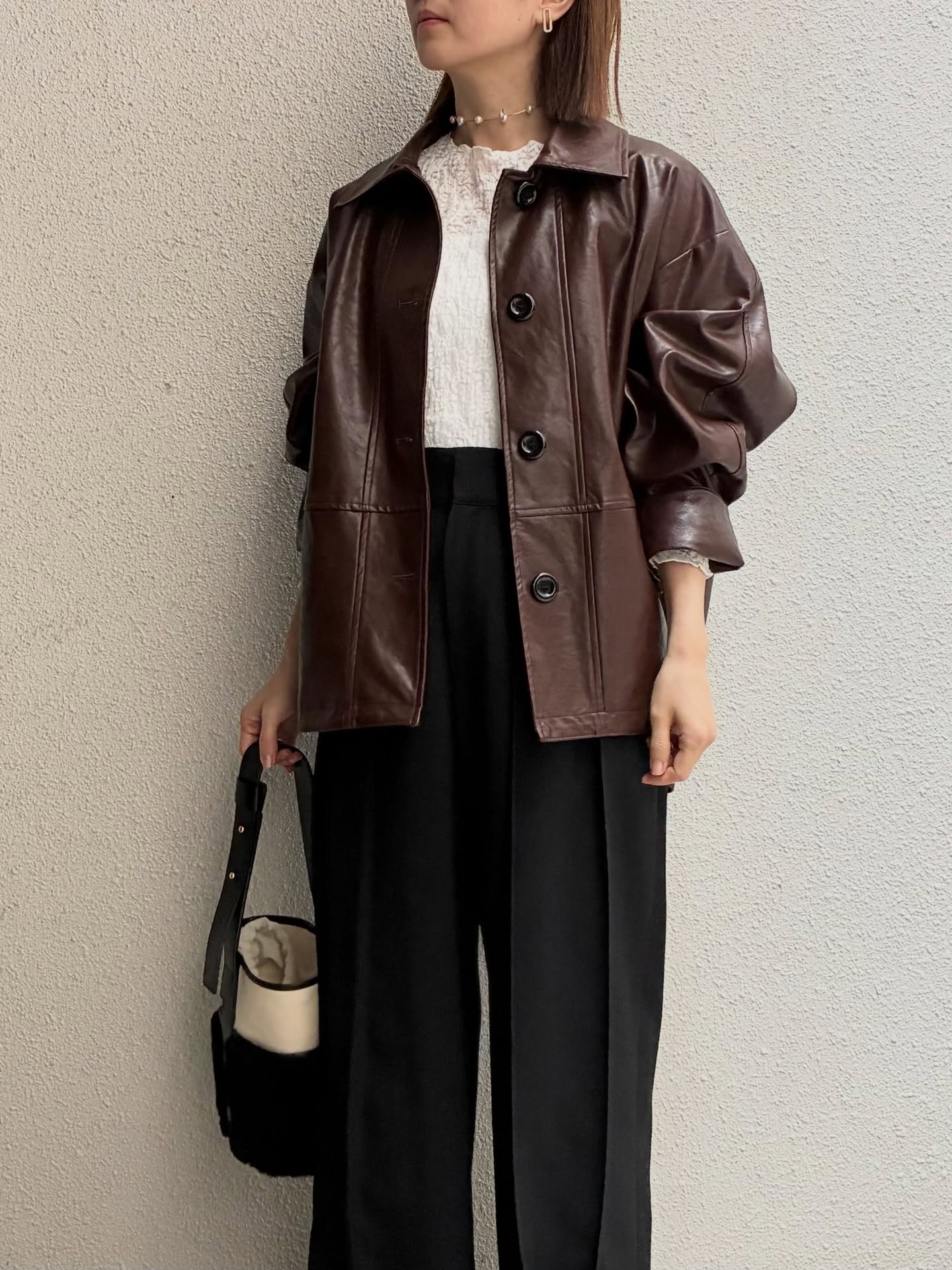 レザージャケットを、品よく軽やかに着こなしているailiretyさん。ハードな印象になりがちなブラウンのレザージャケットですが、インナーに白のレーストップスを合わせることで、顔まわりを明るくやわらかな雰囲気に仕上げています。