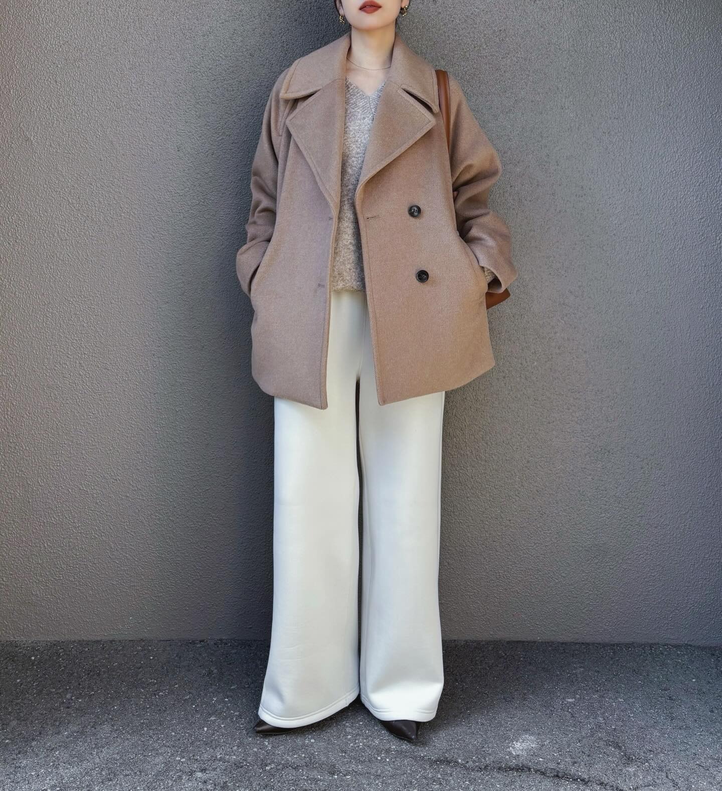 身長163cmのバランスを生かした縦のラインもポイント。色数を抑えることで、素材感やシルエットが引き立つ仕上がりに。頑張りすぎないのに、手抜きに見えないのが凄い。カシミヤ混のピーコートは、ベーシックな形で使いやすく、襟が高めなのもオシャレ。