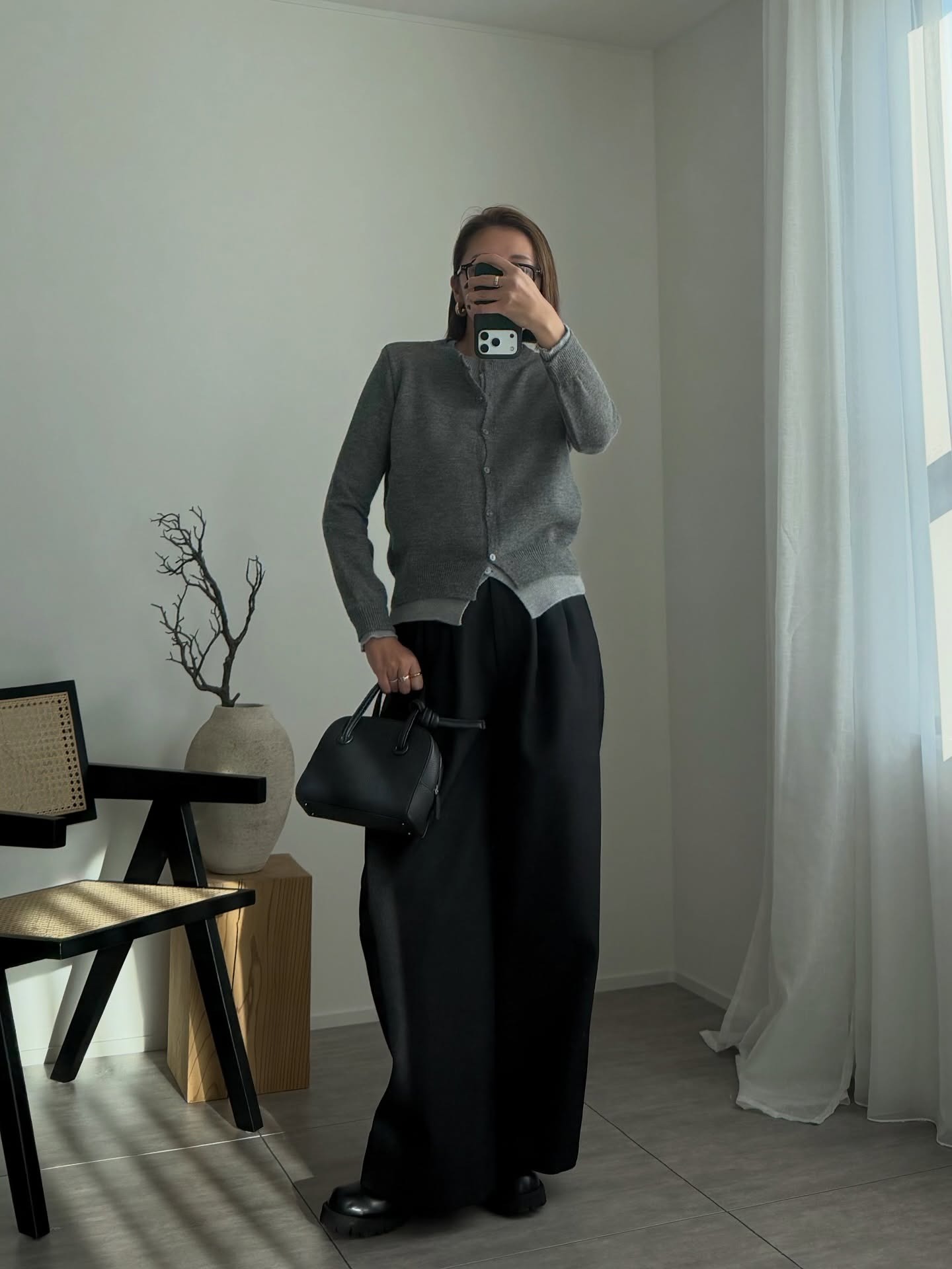トップスはコンパクトなシルエットを選ぶことで、ボリュームのあるワイドパンツとの対比が生まれ、全身のバランスが整います。太めのタックがしっかり入ったパンツは、今季らしいムードを演出するキーアイテム。足元には程よくボリュームのあるシューズを合わせて重厚感を出すのが、全体をモダンに引き締めるコツです。上品なハンドバッグを添えれば、リラックス感とクラス感が同居する、都会的なデイリースタイルの完成です。