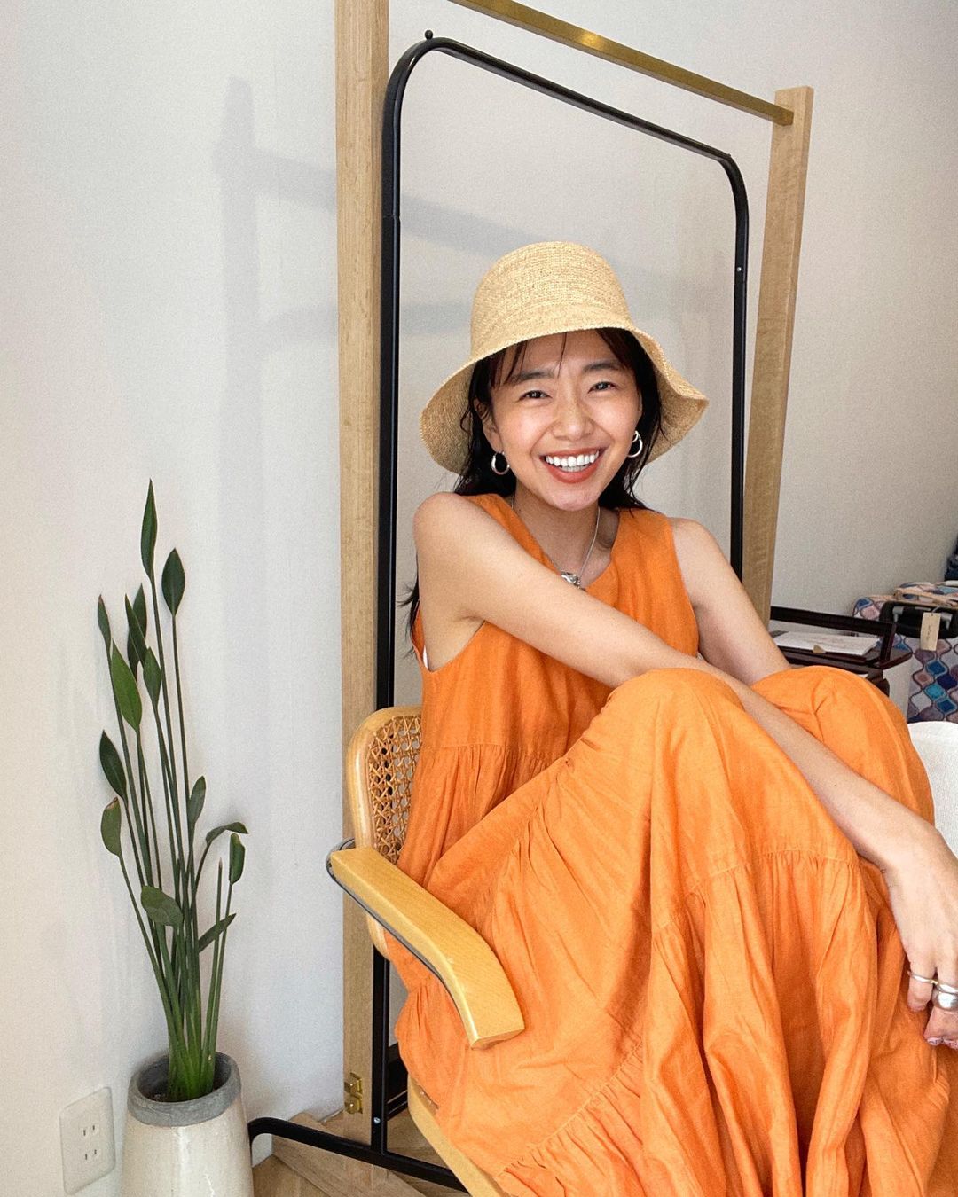 オレンジのワンピースも太陽のような笑顔にぴったりマッチ。さりげない場所で撮影しているのにとってもおしゃれな写真に見えますね。カラー同士の合わせ技や、オレンジ色の面積の多い ワンピなど、カラーを前面に押し出した 知久さんのコーディネートですが、こなれて見えるのは、 知久さんのセンスと絶妙に計算された形や素材のおかげかもしれません。