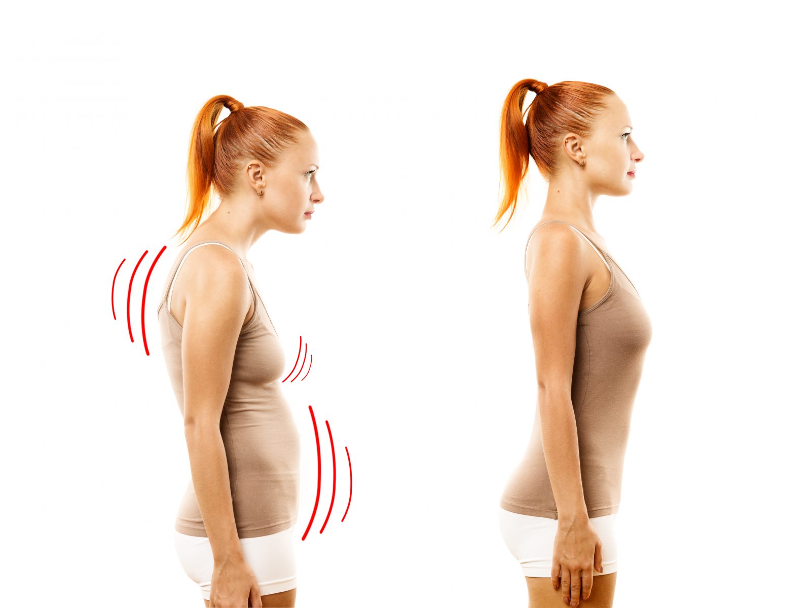 Young woman with position defect and ideal bearing on white background
