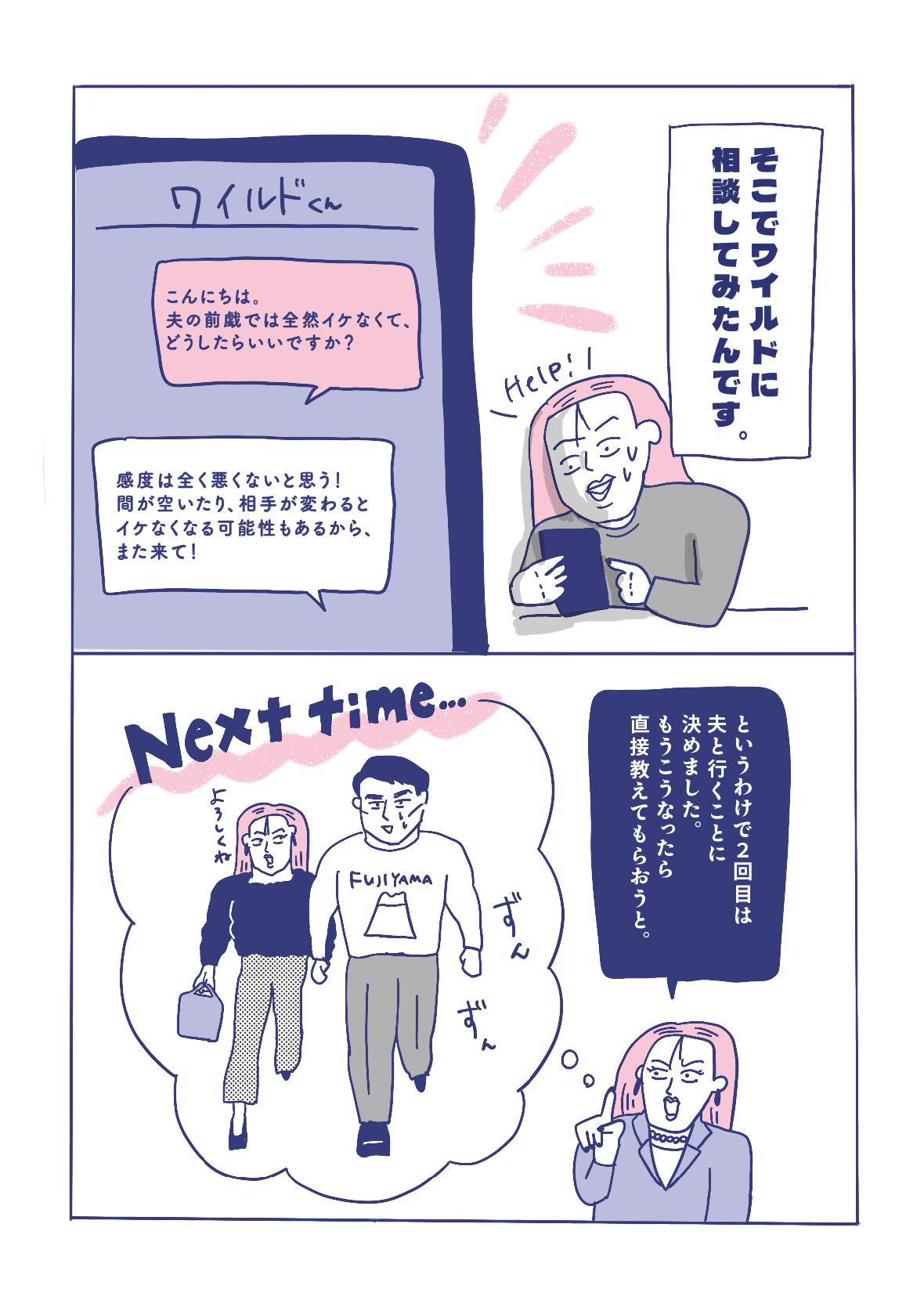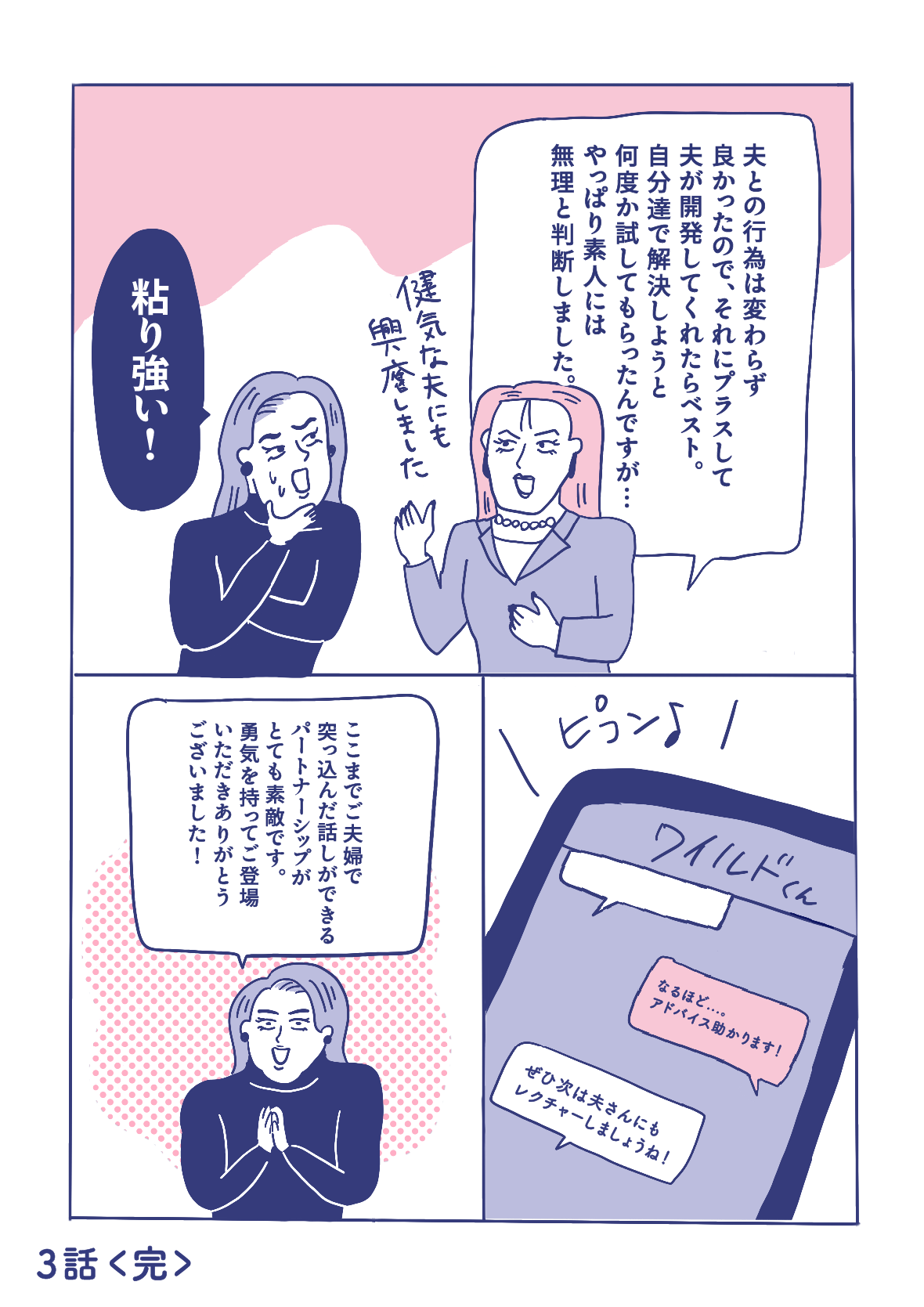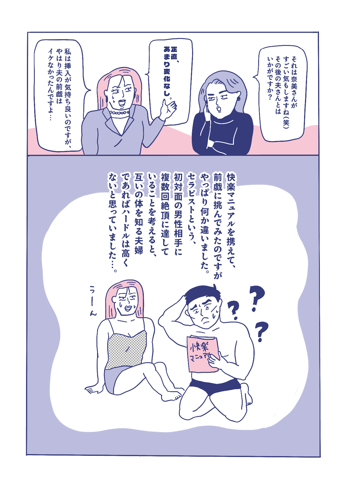 第3話ではプリオさんの体験談を読んで「女性用風俗に関心が湧いてデビューした!」というフォロワー奈美さんへインタビュー。夫さんとの性生活も大満足、仕事も順調。そんな奈美さんがなぜ女性用風俗へ????しかも初回からダブルセラピストで大満足体験。次回の予約をまさかの夫と?!