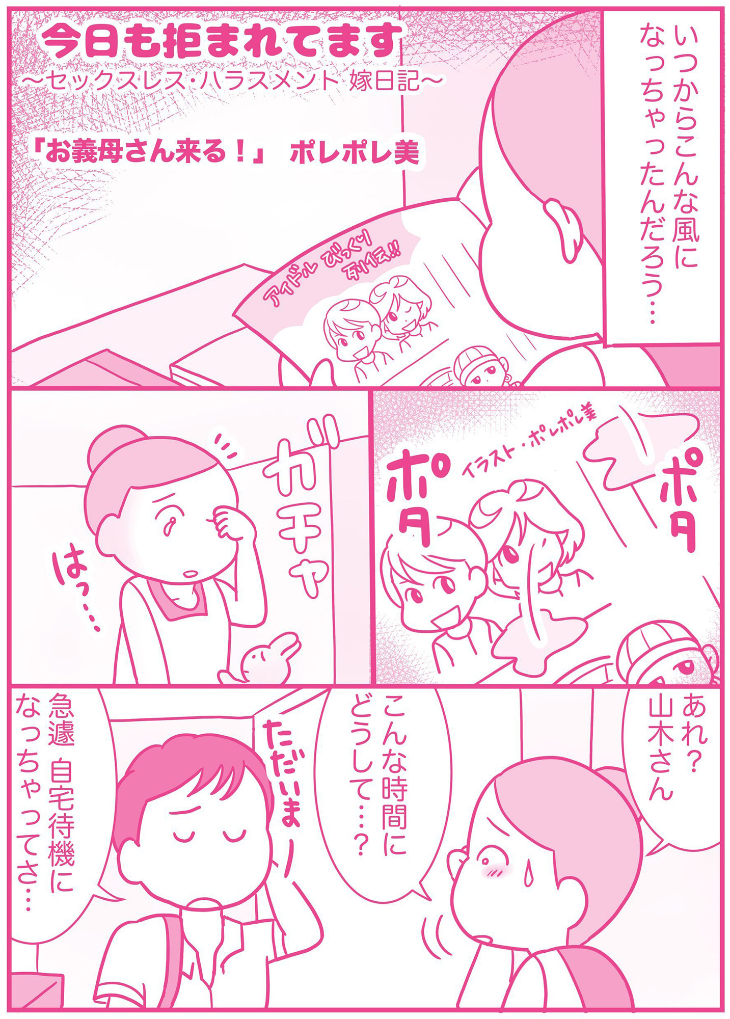 結婚後も続くセックスレスに苦しむポレ美。 訪れたチャンスも逃し、実家では妹の妊娠で期待が高まる中、進まない妊活や子宮頸部の異常、義姉の妊娠が重なり追い詰められていく。 ついに夫へ土下座で訴えるが、すれ違いは深まり心身はさらに闇の中へ――。 レス問題の現実を赤裸々に描く第2弾。 ※本記事はポレポレ美著の書籍『今日も拒まれてます~セックスレス・ハラスメント嫁日記~ 心の異変編』から一部抜粋・編集しました。 ****** ▶▶関連記事を読む【次回】#10に続く 「孫はまだか?」「もうそろそろか?」周りの妊娠がプレッシャーになり、夫に本音をぶつける【今日も拒まれてます2 #10】 関連記事【40代編集部長の婚活記#265】どうしたらいい? バツイチ彼の「子供」問題。【マンガ40代編集長の婚活記#445】あぁ後悔! 彼からの「レスなし」に悩む40代独女【診断】ドS?それともドM?あなたのドM度、ドS度を5秒で診断!それアリなの…?「別れてない」と言い張る不倫ギャルに【なぜ彼女は独身なのか?】(265)【リアル男性心理】婚活アプリってどうなの? 40代バツイチ男がやってみてわかった3つのこと