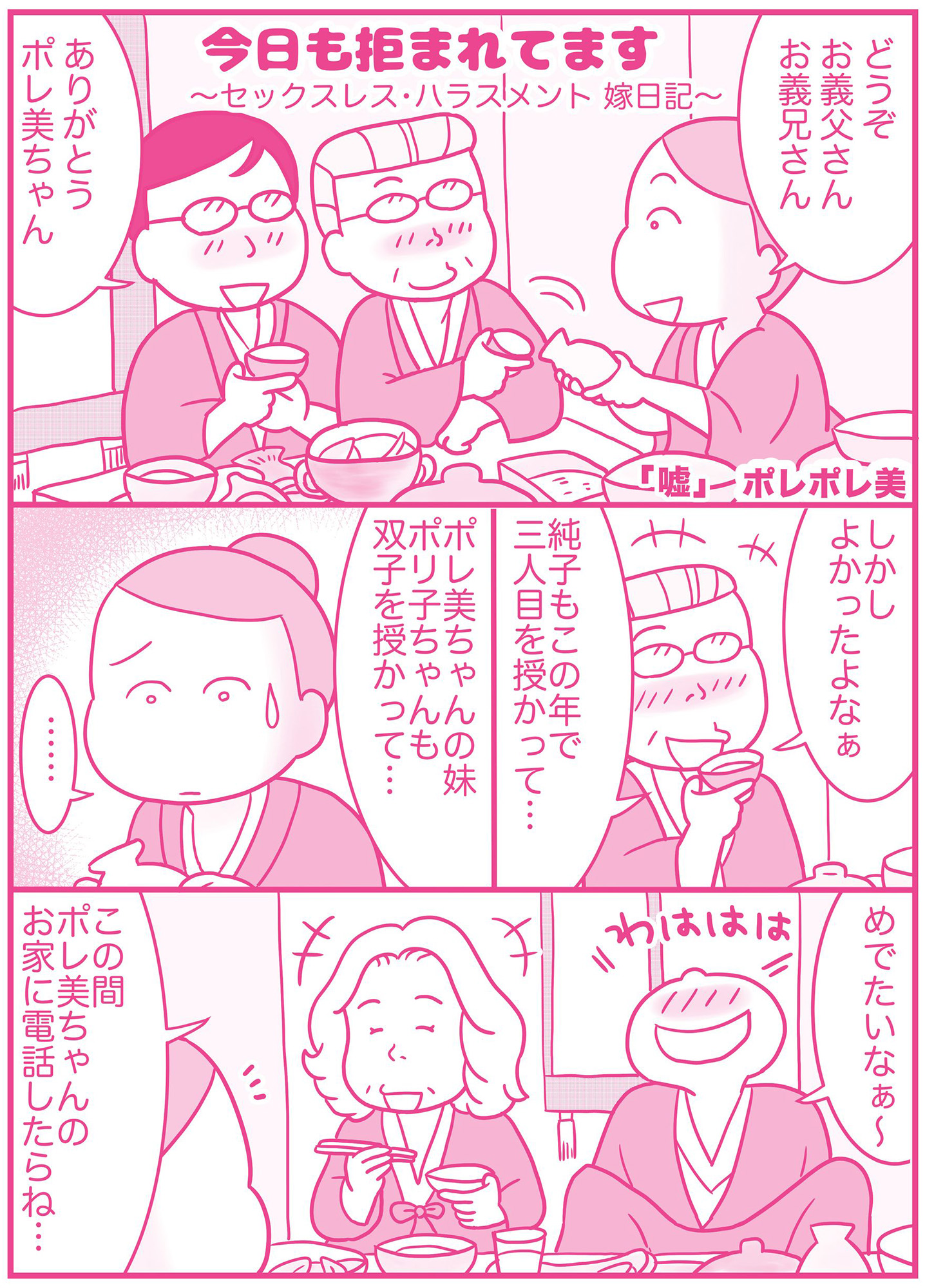 結婚後も続くセックスレスに苦しむポレ美。 訪れたチャンスも逃し、実家では妹の妊娠で期待が高まる中、進まない妊活や子宮頸部の異常、義姉の妊娠が重なり追い詰められていく。 ついに夫へ土下座で訴えるが、すれ違いは深まり心身はさらに闇の中へ――。 レス問題の現実を赤裸々に描く第2弾。 ※本記事はポレポレ美著の書籍『今日も拒まれてます~セックスレス・ハラスメント嫁日記~ 心の異変編』から一部抜粋・編集しました。 ****** ▶▶関連記事を読む【次回】#16に続く 何のために妊活をしているのかわからない…ずっと記録し続けてきた基礎体温表をゴミ箱へ【今日も拒まれてます2 #16】 関連記事「私のなりたい」を叶えることができたのは、オタ友のおかげ【君の推しみたいになれないけれど #11】【40代編集長の婚活記#113】40代独女が憧れる「理想の夫婦のカタチ」とは?藤あや子、魔性の女は意外と「薄情」?オトコを骨抜きにし続ける半生(後編)もうガマンできないよ…カレの生態に、私が達した結論は!(前編)【実話マンガ】いい人だけど…。40代独女が「真剣交際に悩む」理由とは?【マンガ婚活記まとめ84】
