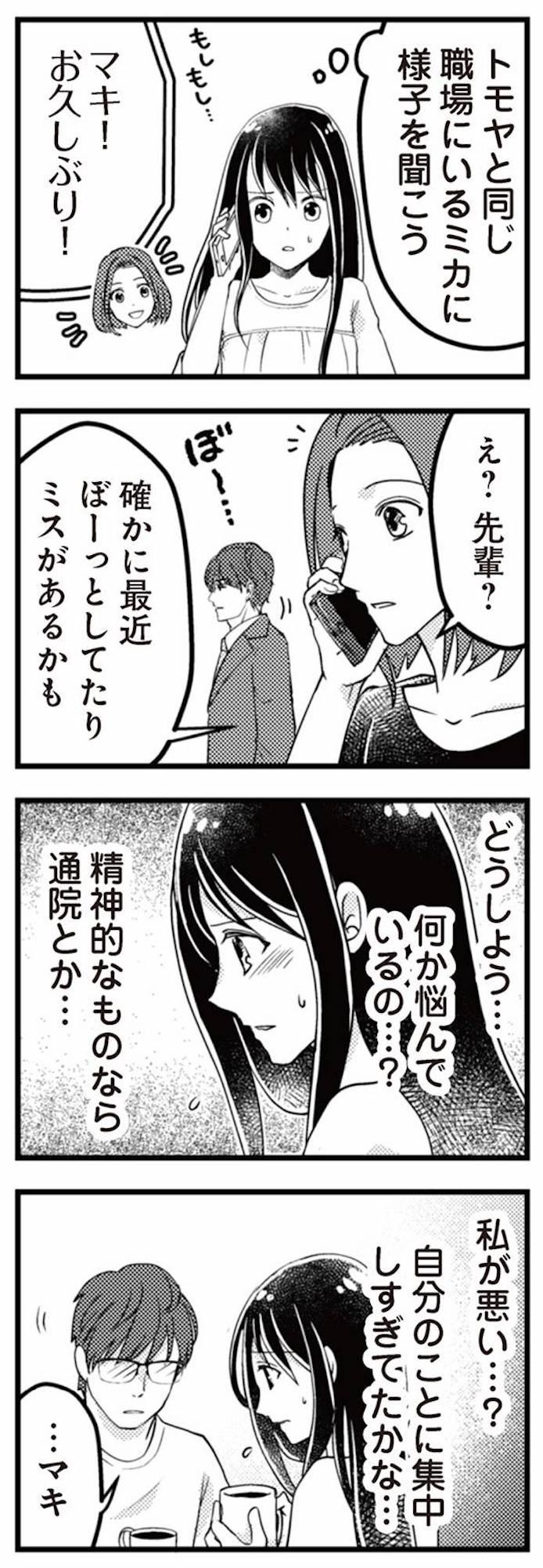 職場で出会い結婚したマキとトモヤ。 結婚4年目にマキの妊娠が判明するものの、つわりが酷く入院する。 やがて体調が安定し、退院前日にトモヤから「明日迎えに行く」と連絡が入るが、当日時間になっても姿を見せない。 不安になったマキが義父母とともに家に戻ると、義母の元にトモヤから「父親になる自信がなくなった」と連絡が入る――。 ※本記事は原作・コマ、イラスト・漫画・蒼衣 ユノの電子書籍『サレ妻になり今は浮気探偵やってます 里帰り中に夫が駆け落ちしてました』から一部抜粋・編集しました。 ****** 関連記事自慢のイケメン彼氏「それはあり得ない」まさかの大告白に【なぜ彼女は独身なのか?】(197)【実話マンガ】その手があったとは!モテない独女に人生初の彼がついに出来た(前編)不倫している女性が多い血液型って? オトナ女性の「生の声」!(前編)モヤモヤが止まらない元カノ問題を相談した意外な相手とは?そしてなにやら波乱の予感。【なぜりこ#136】6歳年下の「恋人もどき」…?それっていわゆる(伏せ字)なのでは【なぜ彼女は独身なのか?花澤さん編】(57)