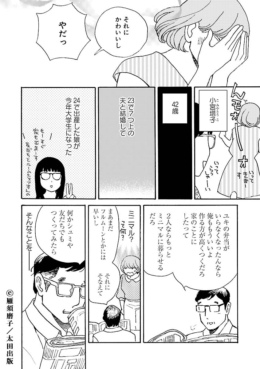 40代がぶち当たる「壁」をあまりにもリアルに描き出し、熱く静かな共感をさらった雁須磨子さん『あした死ぬには、』2巻が発売されました。1巻の冒頭を12日連続で特別配信します。こんどは、新しく仕事を始める女性。