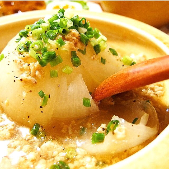 このレシピはソテーした玉ねぎの上に、たっぷり自家製の肉味噌をのせた絶品のおかずです。