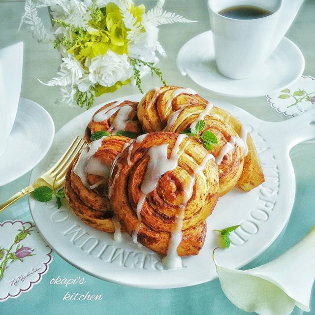 朝から目が覚めるような甘いシナモンロールは、渋く入れたコーヒーに良く合いますよ。