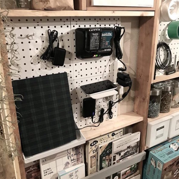ダイソーのパンチングボードを使って、コードやスマホを収納されています。