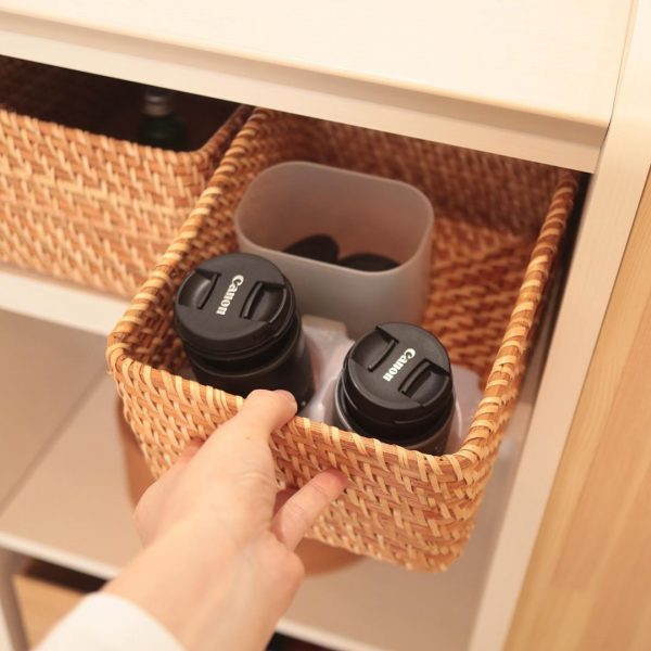 角ばっているので棚に収めやすく、カメラグッズや充電器などを、取り出しやすく収納できるのがポイント。