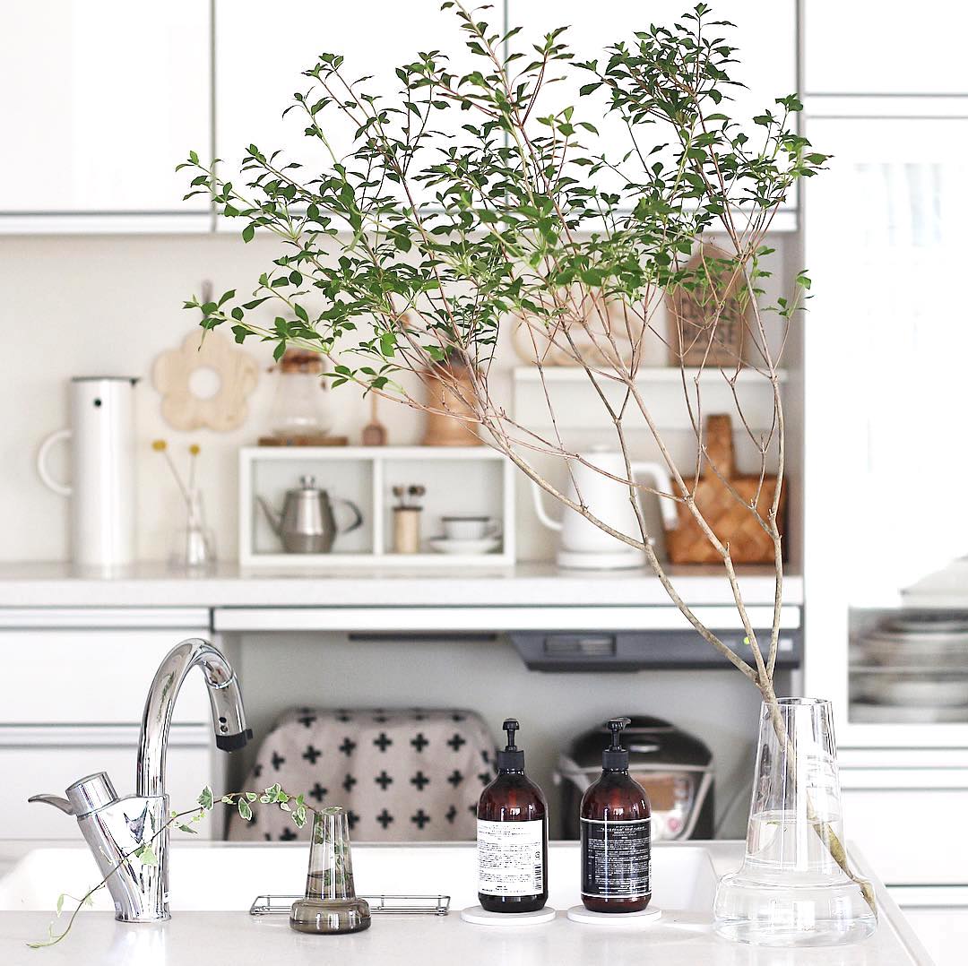 シンプルでナチュラルテイストのキッチンには、グリーンをアクセントにするのがおすすめです。