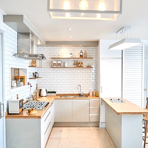 長方形タイルをヘリンボーン柄に貼り付けたお洒落なキッチンの壁。ホワイトにベージュのアクセントを加えることでデザインがより一層引き立ちますね。