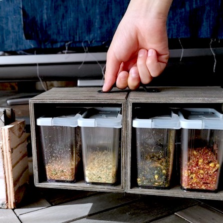 セリアのインテリアキューブディスプレイボックスをDIYした、持ち運び可能な手作り調味料ケース。