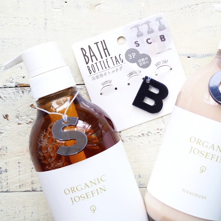 セリアで見つけた「浴室用ボトルタグ」。