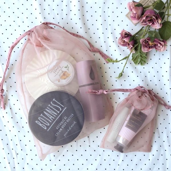 トレンドのシアー素材で中身が透けて見えるのがなんともおしゃれ。口をキュッとしぼるだけで小物入れとしても活躍し、軽いのでバッグに入れてもかさばりません。
