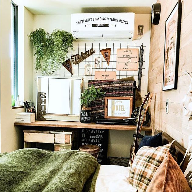 窓側には多肉植物などを並べ、エアコン周辺をナチュラルでレトロ感のある空間にまとめています。
