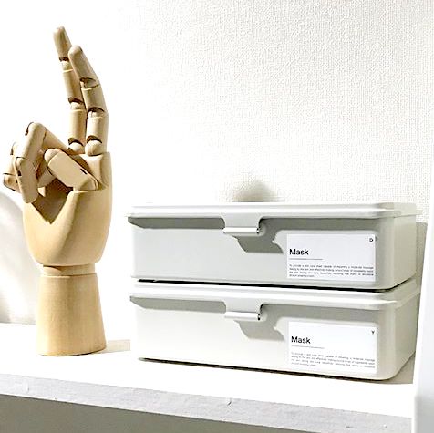 こちらはプラスチックのケースにマスクを収納し、アクセサリーなどが収納されている棚に置いています。