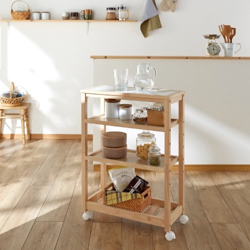 無垢な風合いがおしゃれな木製のキッチンワゴンです。天然木に合わせた白の天板とキャスターは清潔感がありますよね。