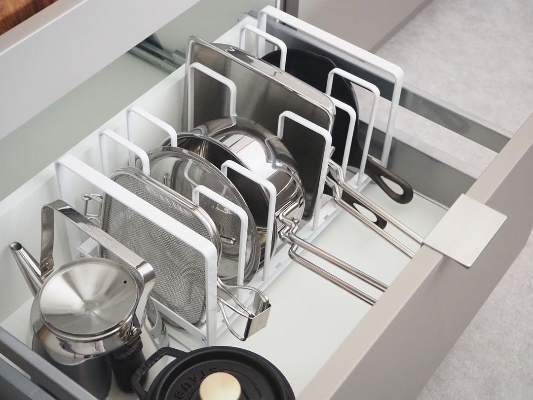 フライパンややかん、鍋などのキッチングッズを立てて収納することで、出し入れがしやすくなります。