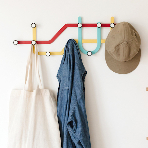 使っていない時でも、インテリアのアクセントになってくれるでしょう。こちらは、カラフルな路線図のようなデザインが印象的な壁掛けフックです。