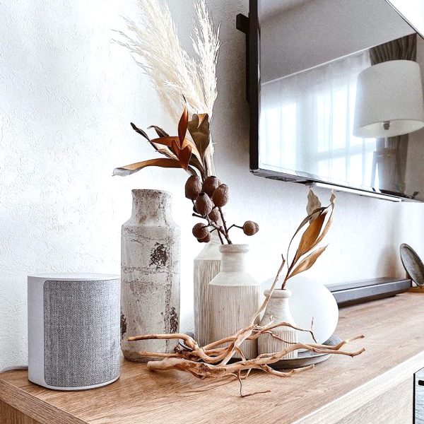 テレビボードの上とは思えないほど、とてもおしゃれな空間となっていますね。サイズ違いのフラワーベースの中にはドライフラワーを少しずつ挿しているところが素敵です。