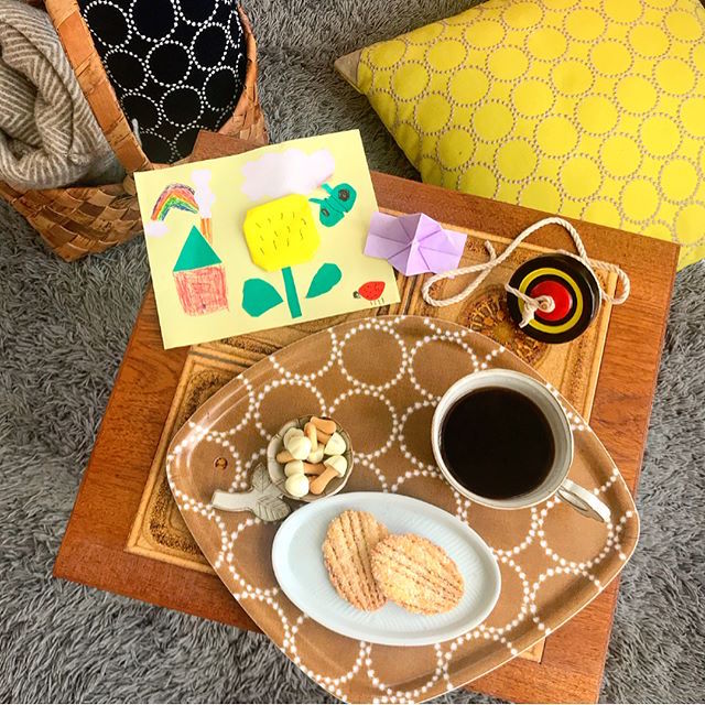 イイホシユミコさんのプレートとタンバリンタイルを組み合わせた、シンプルでおしゃれなおやつタイム。