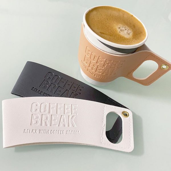 レザー調のスリーブカバーは、カップにかぶせるだけで取っ手を持って持ち運びができます。