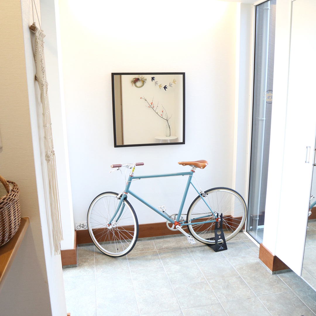 本来ならば、土間空間やシューズクローゼットに収納するであろう自転車を、ディスプレイしたインテリア実例です。
