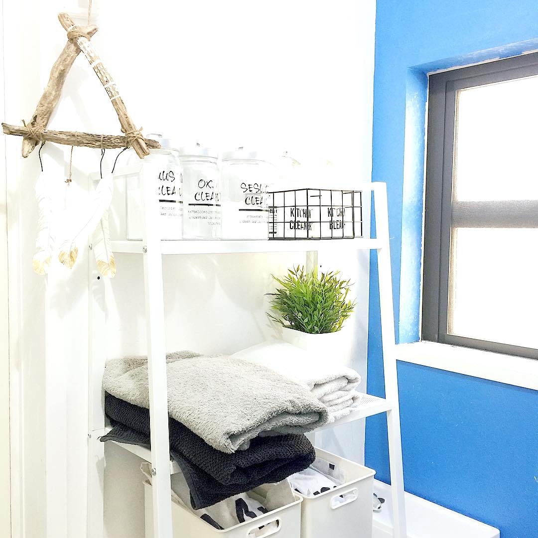 ディアウォールなどのDIYパーツで組み立てた壁面収納にさりげなく置いて、爽やかでナチュラル感のある空間にまとめています。