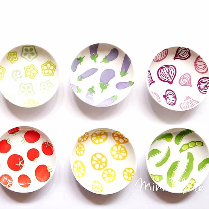 トマトやおまめ、なすび、オクラ、たまねぎなど野菜モチーフのお皿はカラフルで可愛いです。