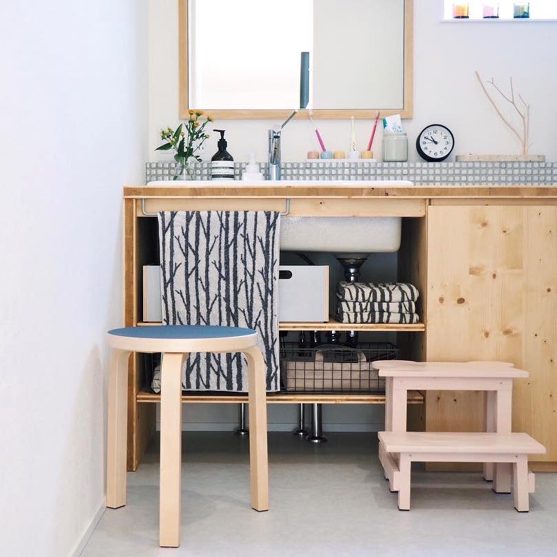 洗面所にスツール60があれば座って歯磨きしたり洗濯かごを置いたりするのに便利です。