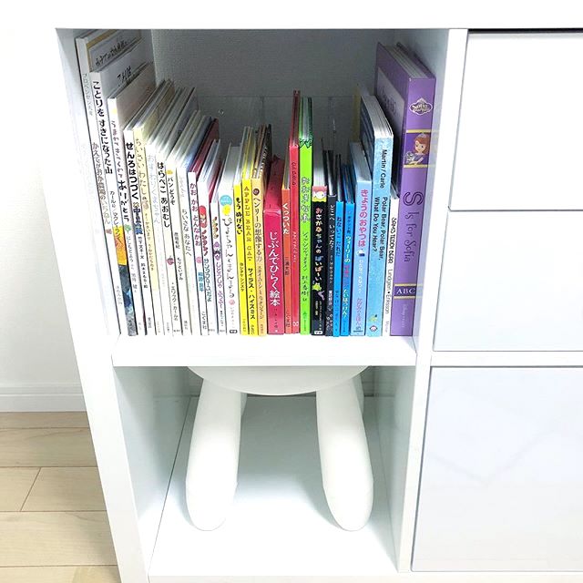 専用のボックスを入れず絵本をずらりと並べただけで図書館のような雰囲気に。