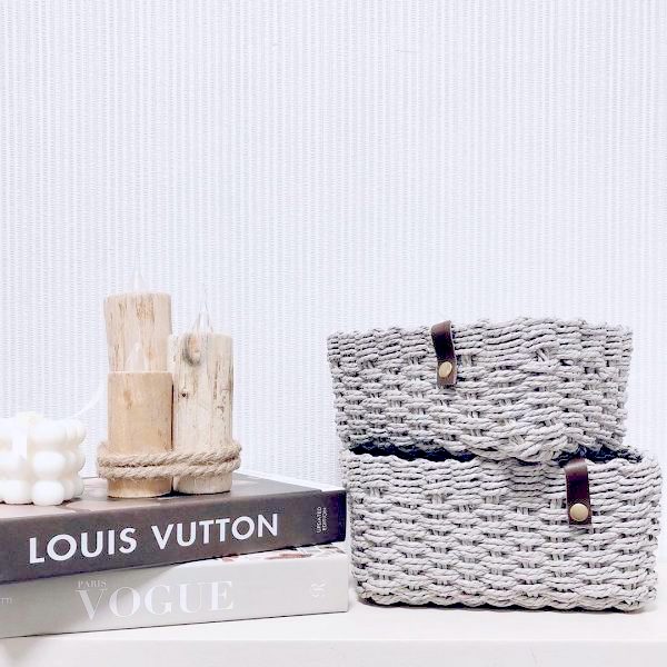 淡いグレーの収納ボックスは小物類の収納にとっても便利です。