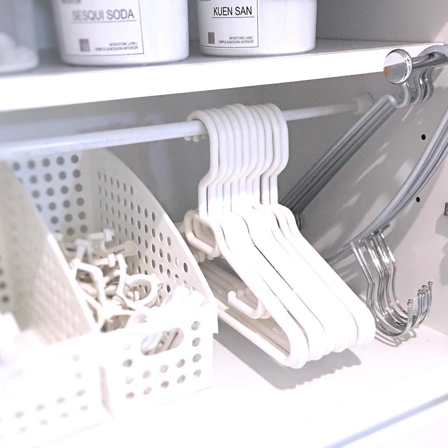 S字フックとつっぱり棒で掛けて収納しておけば、取り出しの手間がグッと減らせますよ。並べておくことで、選ぶのも楽しくなりますね。