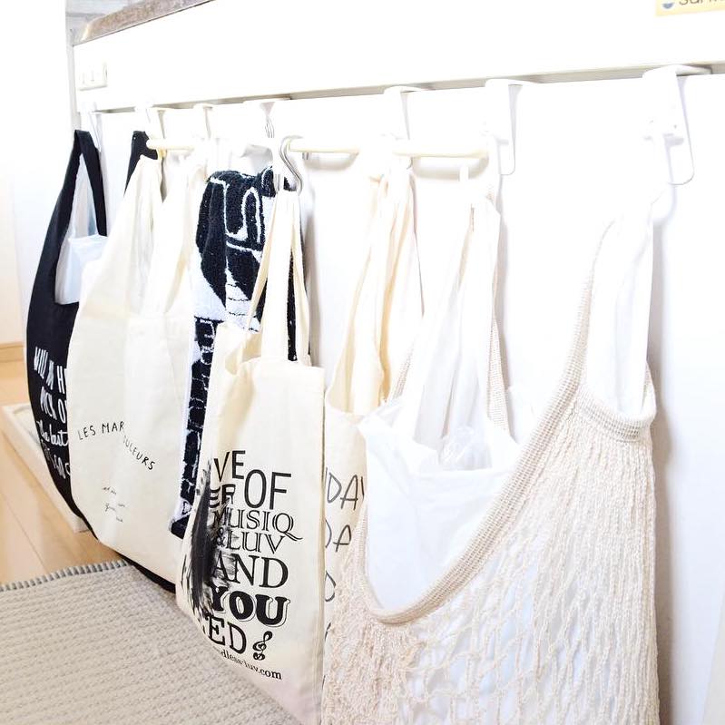こちらのお宅では、ゴミ袋をキッチンの扉に吊り下げています。生活感漂うゴミ袋を隠すために、可愛いマルシェバッグを被せて使用するとおしゃれ。