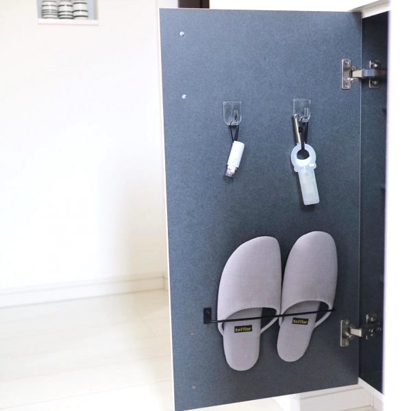 扉の裏にアイアンバーを固定し、スリッパを引っ掛けて収納されています。