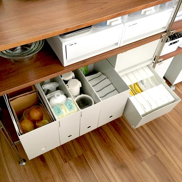 ファイルボックスは、サイズの種類が豊富なのが魅力です。乱雑に置かれた食器をファイルボックスに入れると、生活感を隠して綺麗に見えますよ。