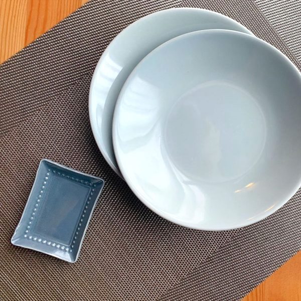 滑らかな質感の淡いブルーグレーが大人可愛い風情の丸皿。シンプルだからいろいろな使い方で楽しむことができますね。