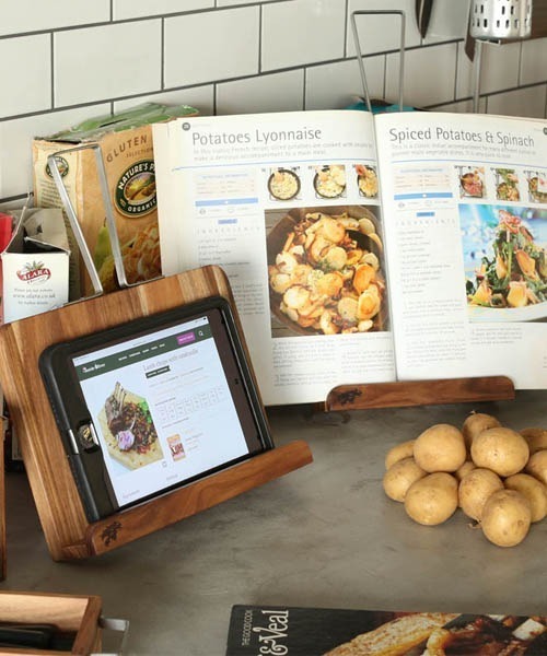 まずは、天然木の風合いが美しいiPad用スタンドです。見やすい角度で固定してくれて、料理本のブックスタンドとしても役立ちますよ。