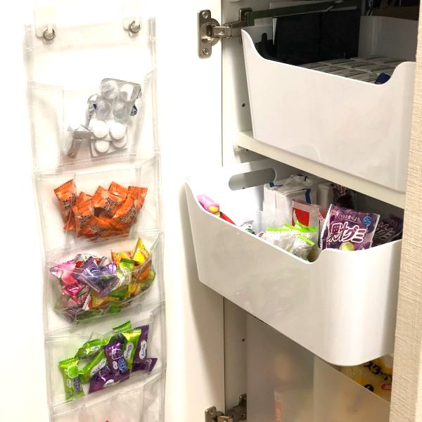 飴やハイチュウなどの小さなお菓子をウォールポケット保存されています。