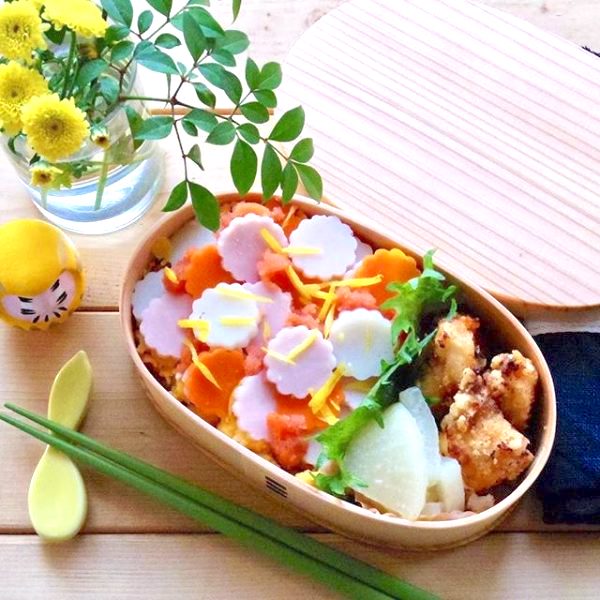 お弁当に入れて華やかにしてみてはいかがでしょうか。最後に菊の花もちらして美しく仕上げています。