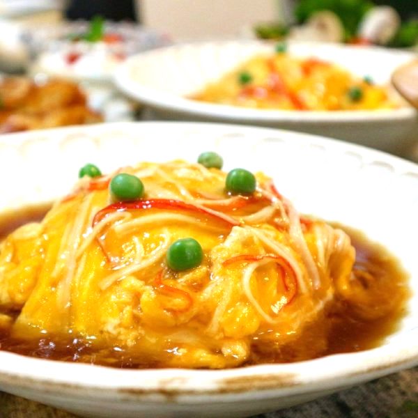 かにカマの赤色と玉子の黄色、そしてグリーンピースの緑色が美しい天津飯は、甘酢が美味しい中華献立の主食レシピですね。